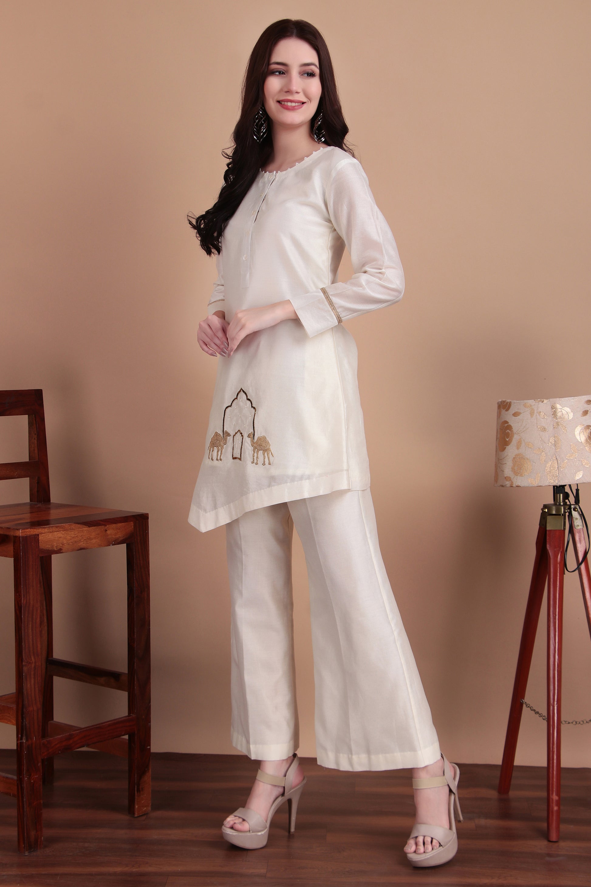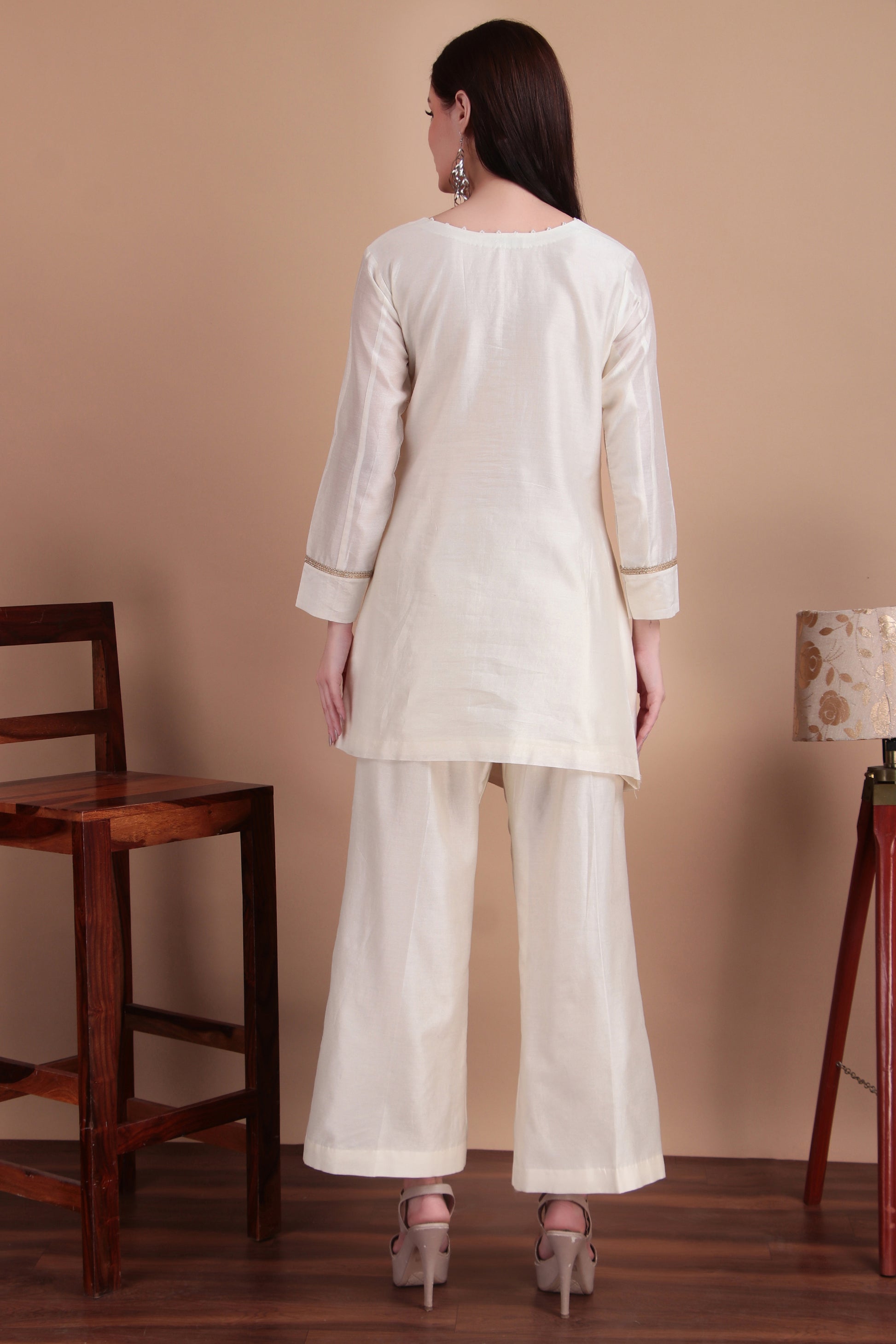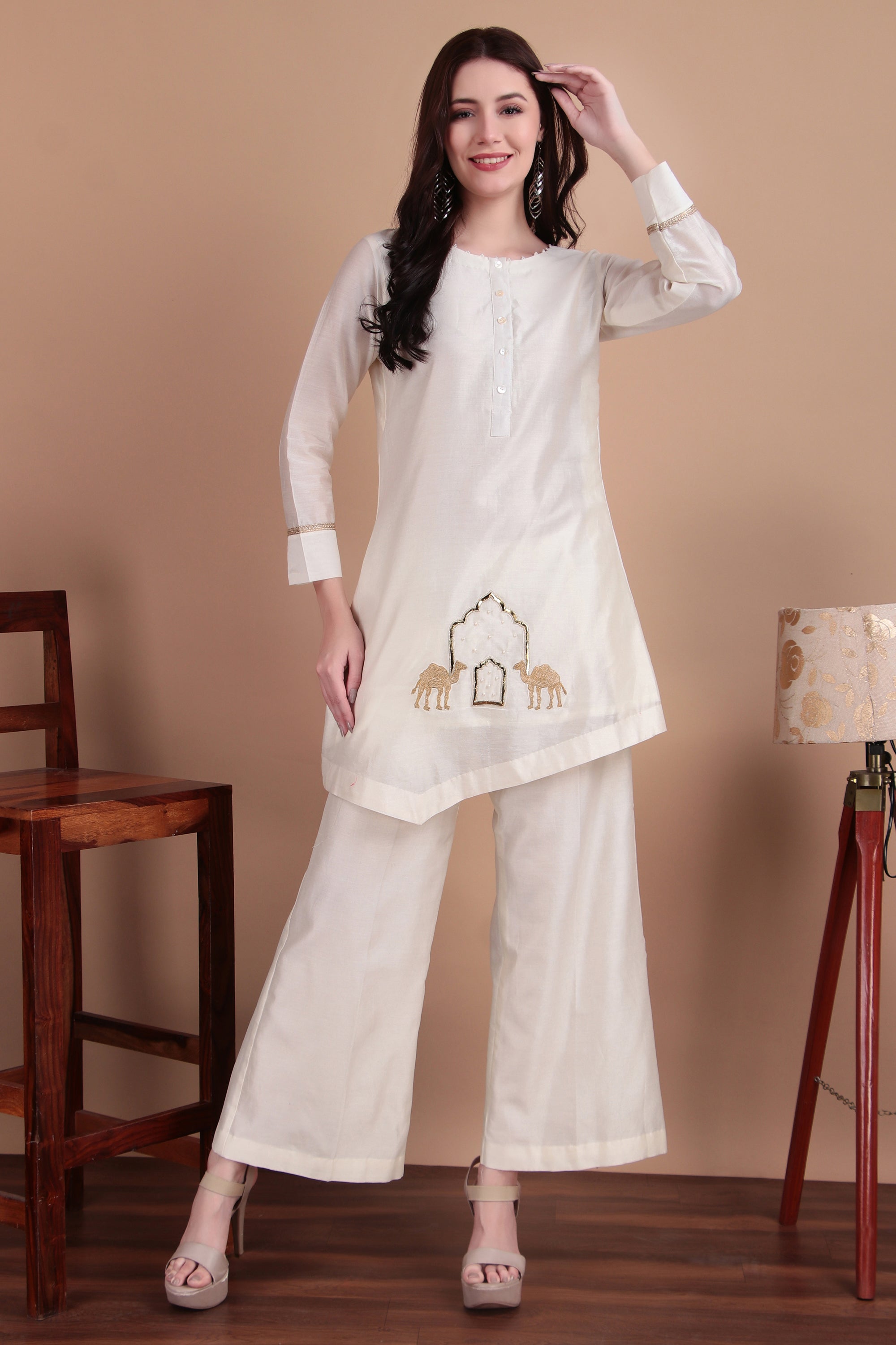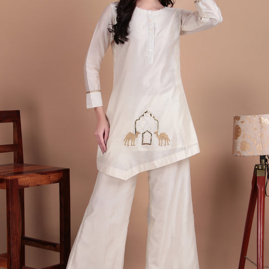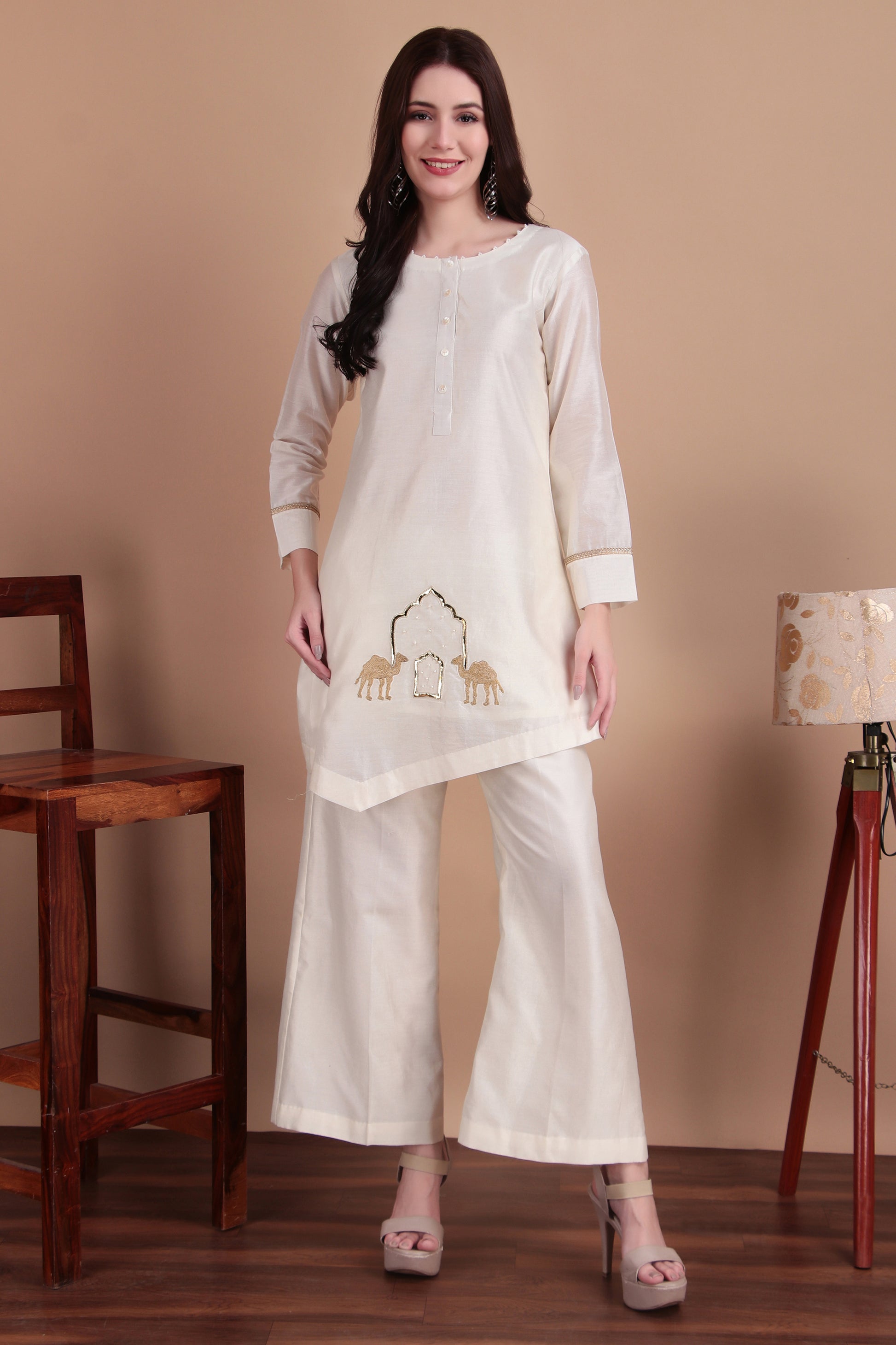 Premium chanderi cotton silk fabric embellished with golden pita machine work .